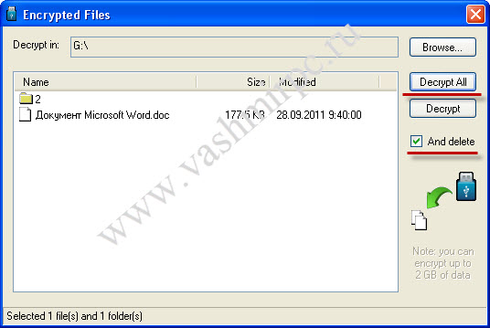 Для того, что бы удалить программу с флешки нужно извлечь всю информацию, нажав кнопку Decrypt All, отметив перед этим птичку And delete (Так как не сделав этого, вы не сможете отформатировать флешку, так как программа защищает Ваши данные):