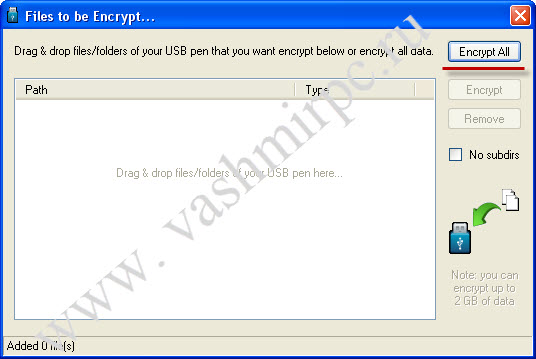 Потом у Вас откроется окно для криптования (шифрования данных). Если Вы подготовили флешку и все файлы, которые в данный момент на там находятся, Вы хотите защитить паролем, то нажимаем кнопку Encrypt All: