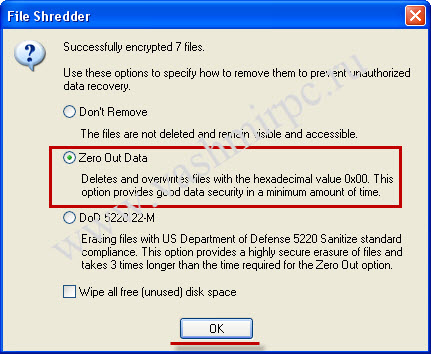 После того как программа завершит процесс криптования, появится окно с предложением удалить файлы с флешки, которые были закриптованы. Подтверждаем, отметив нужный пункт, и нажимаем "ОК”: