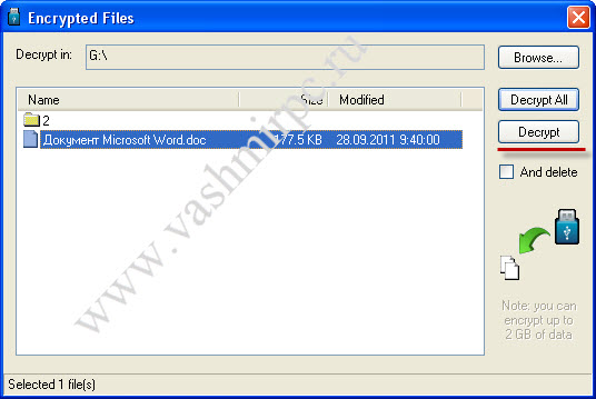 Как видите, информация удалилась и закриптовалась и теперь, что бы к ней добраться нужно запустить файл usbsafeguard.exe, который находится на нашей флешке, ввести пароль для доступа, выбрать файл или папку для восстановления и нажать Decrypt: